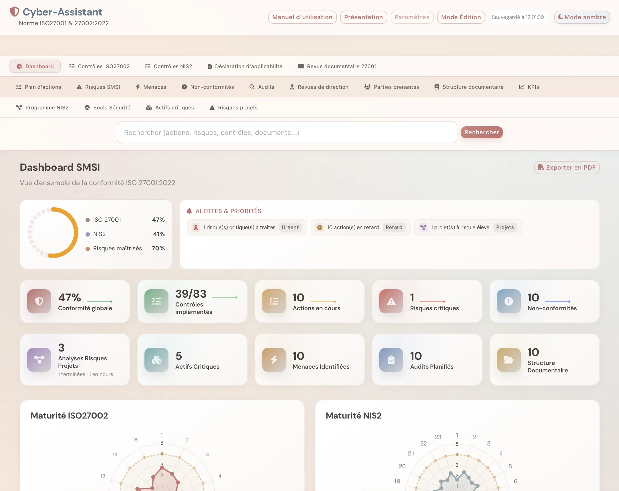KPIs cliquables, radars de maturité ISO 27002 et NIS2, matrice des risques impact × probabilité, graphiques d'évolution.