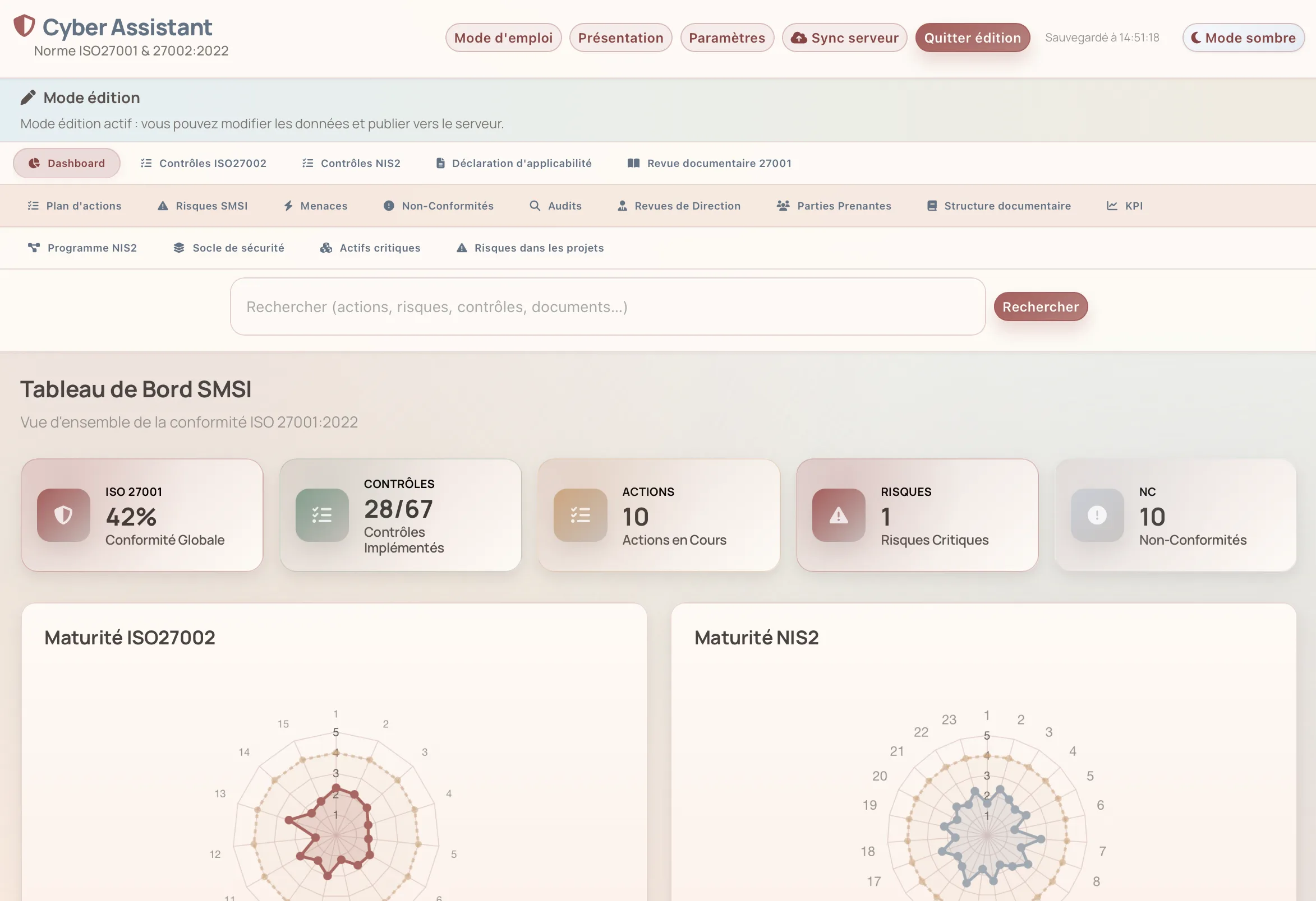 KPIs cliquables, radars de maturité ISO 27002 et NIS2, matrice des risques impact × probabilité, graphiques d'évolution.